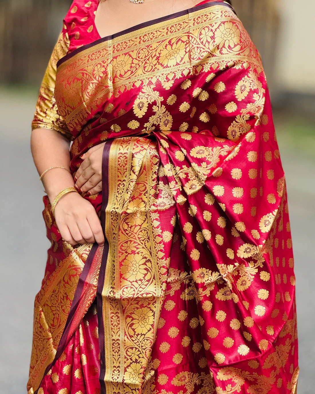ব্লাউজ পিস সহ খয়েরী সফট লতা কাতান শাড়ি